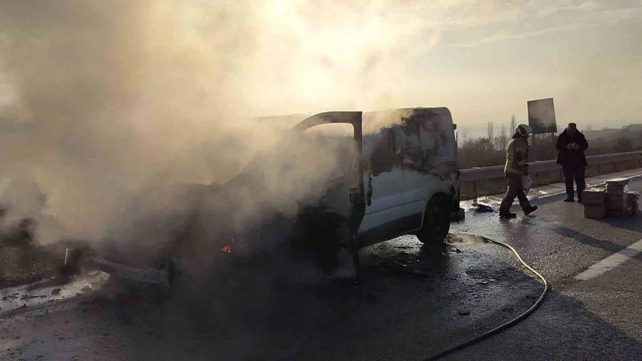 Seyir halindeki minibüs alev aldı
