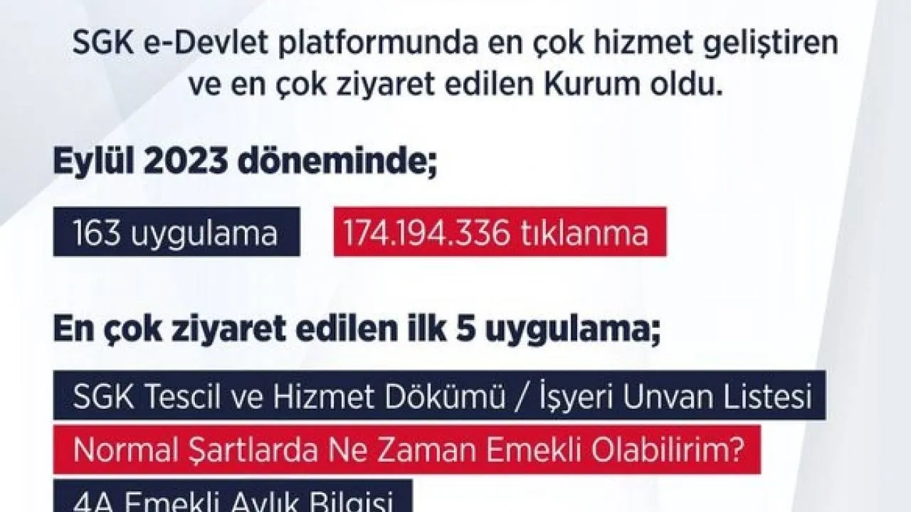 Ayrıca e-Devlet’te SGK’da en çok ziyaret edilen 5 uygulama “SGK Tescil ve Hizmet Dökümü", "Normal Şartlarda Nasıl Emekli Olabilirim", "4A Emeklilik Bilgisi", "GSS Tescil ve Prim Borcu Sorgulama" ve "Şahıs Ödemeleri” oldu.