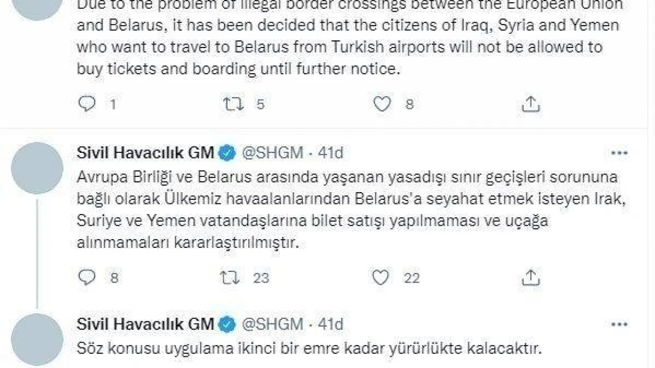 Sivil Havacılık Genel Müdürlüğü’nün resmi Twitter hesabından konuya ilişkin yapılan duyuruda, “Avrupa Birliği ve Belarus arasında yaşanan yasadışı sınır geçişleri sorununa bağlı olarak ülkemiz havaalanlarından Belarus’a seyahat etmek isteyen Irak, Suriye ve Yemen vatandaşlarına bilet satışı yapılmaması ve uçağa alınmamaları kararlaştırılmıştır. Söz konusu uygulama ikinci bir emre kadar yürürlükte kalacaktır” ifadelerine yer verildi.