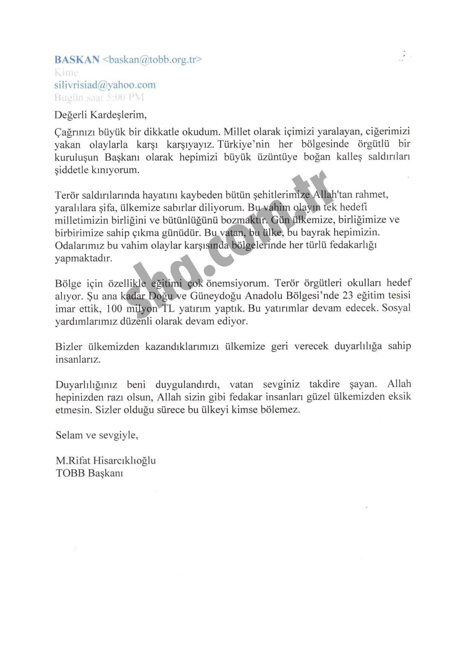 Değerli kardeşlerim; Çağrınızı büyük bir dikkatle okudum. millet olarak içimizi yaralayan, ciğerimiz yakan olaylarla karşı karşıyayız. Türkiye'nin her bölgesine örgütlü Bir kuruluşun Başkanı olarak hepimizi büyük bir üzüntüye boğan kalleş saldırıları şiddetle kınıyorum.