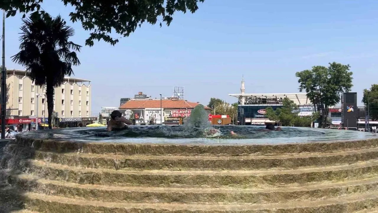 Bursa’da sıcak havaların etkisiyle bunalan çocuklar süs havuzuna girdiler. Elektrik akımının olduğu suda yüzen çocukların tehlikeli oyunu ise kameralara yansıdı.