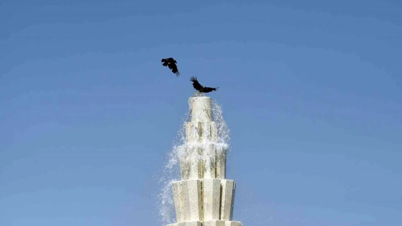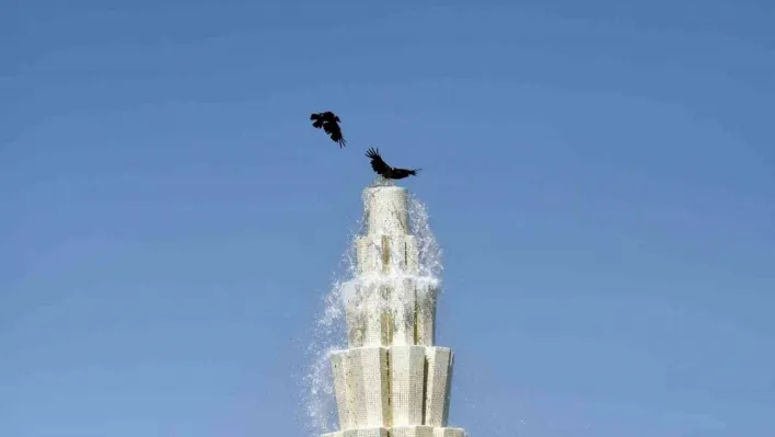 Sıcaktan bunalan kargalar süs havuzunda böyle serinledi