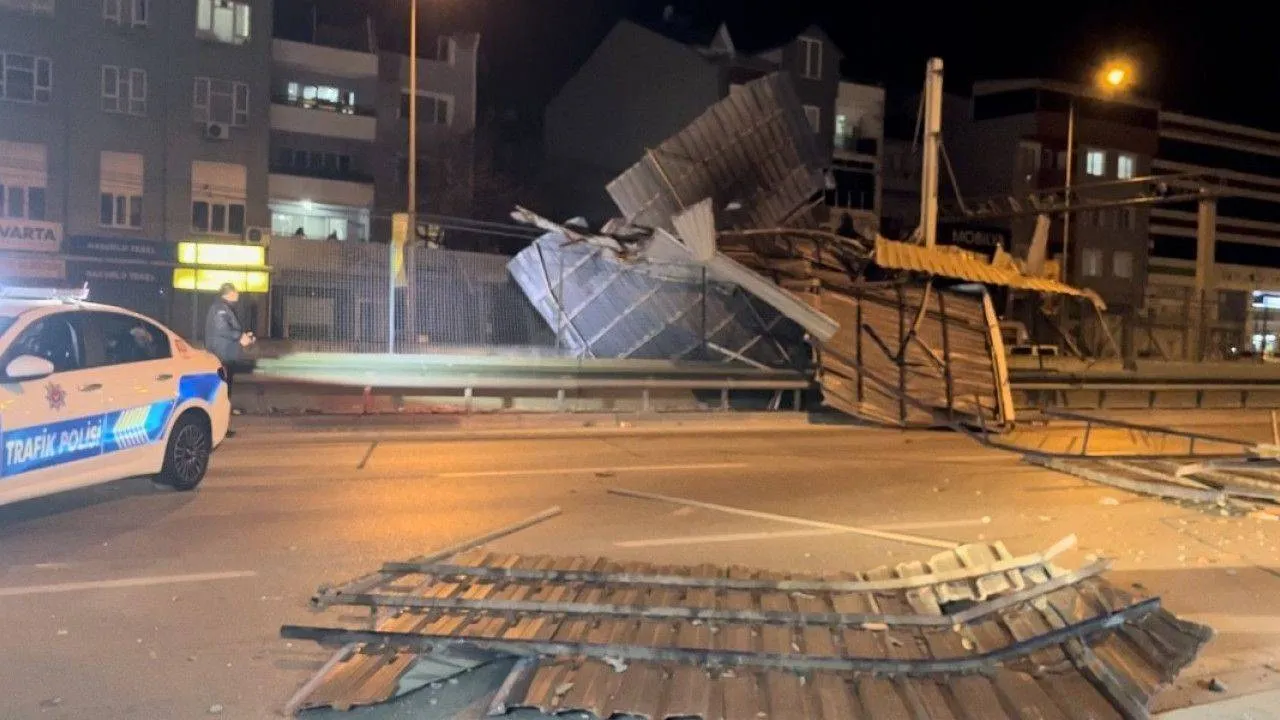 Bursa'da öğle saatlerinde etkisini gösteren şiddetli lodos gece saatlerinde de hız kesmedi. 3 katlı bir binanın çatısı ise fırtınanın etkisiyle uçup metro güzergahı ve anayola düştü.