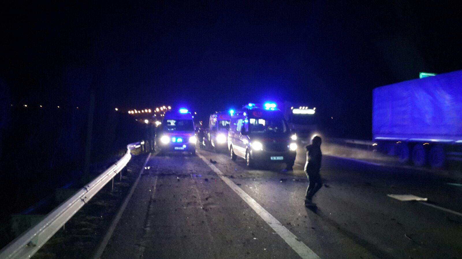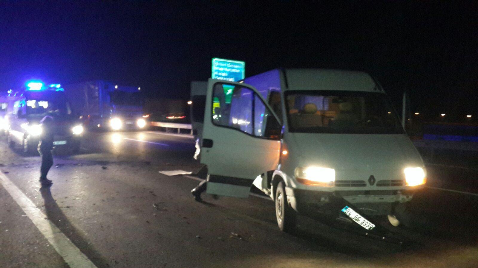 Kaza, bu akşam TEM otoyolu Edirne istikametinde meydana geldi. İçerisinde sığınmacıların olduğu ticari araç sürücüsü, Kınalı gişelerden iki kilometre sonra direksiyon hâkimiyetini kaybetti. Önce yol kenarındaki bariyerlere çarpan araç daha sonra yol ortasında durabildi.