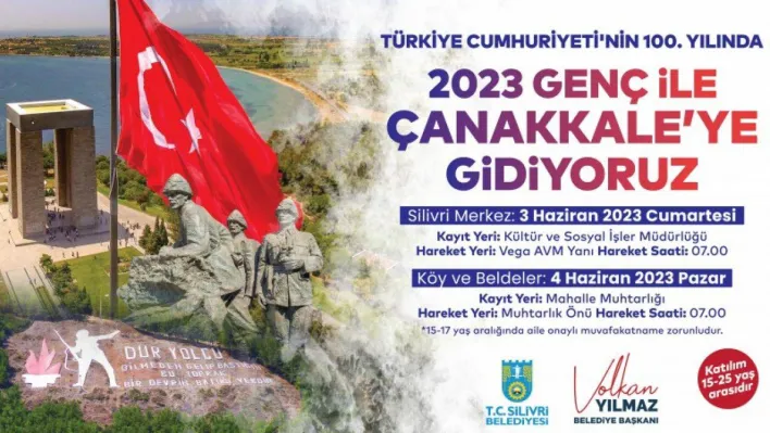 Silivri Belediyesi, Türkiye Cumhuriyeti'nin kuruluşunun 100. yıl dönümü etkinlikleri kapsamında 2023 gencin katılacağı Çanakkale Gençlik Gezisi düzenliyor. 3 Haziran 2023 Cumartesi ve 4 Haziran 2023 Pazar günü gerçekleştirilecek etkinlikte Çanakkale'nin tarihi, kültürel ve dini yapıları ile şehitlikleri gezilecek.