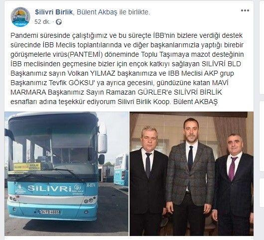 Silivri Birlik Otobüsleri Kooperatif Başkanı Bülent Akbaş, sosyal medya hesabından yaptığı açıklama ile Silivri Belediye Başkanı Volkan Yılmaz'a teşekkür etti. Mazot desteğine dikkat çeken Akbaş, şunları söyledi: "Pandemi süresinde çalıştığımız ve bu süreçte İBB'nin bizlere verdiği destek sürecinde İBB Meclis toplantılarında ve diğer başkanlarımızla yaptığı birebir görüşmelerle virüs döneminde Toplu Taşımaya mazot desteğinin İBB meclisinden geçmesine bizler için ençok katkıyı sağlayan Silivri Belediye Başkanımız Sayın Volkan Yılmaz başkanımıza ve IBB Meclisi AKP Grup Başkanımız Tevfik Göksu'ya ayrıca gecesini, gündüzüne katan Mavi Marmara Başkanımız Sayın Ramazan Güler'e SILİVRİ BİRLİK esnafları adına teşekkür ediyorum Silivri Birlik Koop. Bülent AKBAŞ"