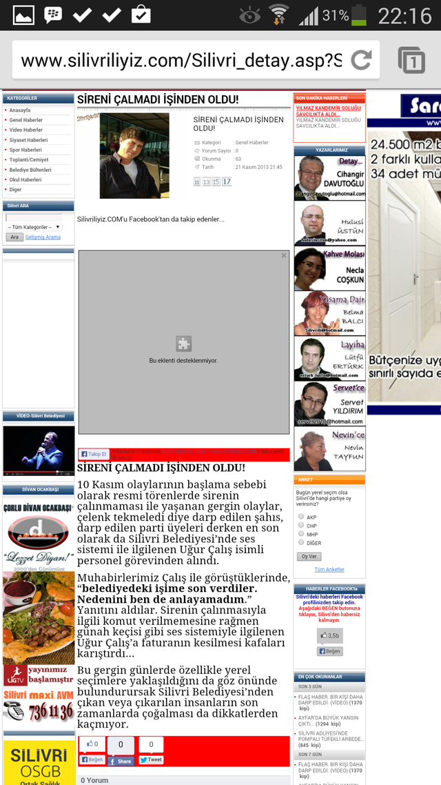 10 Kasım Atatürk’ü Anma Günü’nde Silivri ilçemizde yaşanan olaylar halkımızın malumudur. Ancak olayın üzerinde yaşanan tartışmaların ardından 21.11.2013 tarihi saat 21:45 sularında silivriliyiz.com haber sitesinde yayına konan “Siren çalmadı işinden oldu” başlığı altındaki haberde, sireni çalmadığı için işinden olduğu ifade edilen Uğur Çalış, Cumhuriyet Halk Partisi Silivri İlçe Gençlik Kolları Üyesi olup, bugüne kadar Silivri Belediyesi ile resmi bir bağı hiç olmamıştır. Hatta olayın yaşandığı ifade edilen dönemde Çalış, Yeni Sanayi Sitesi’nde babasına ait olan işletmede çalışmaktadır.