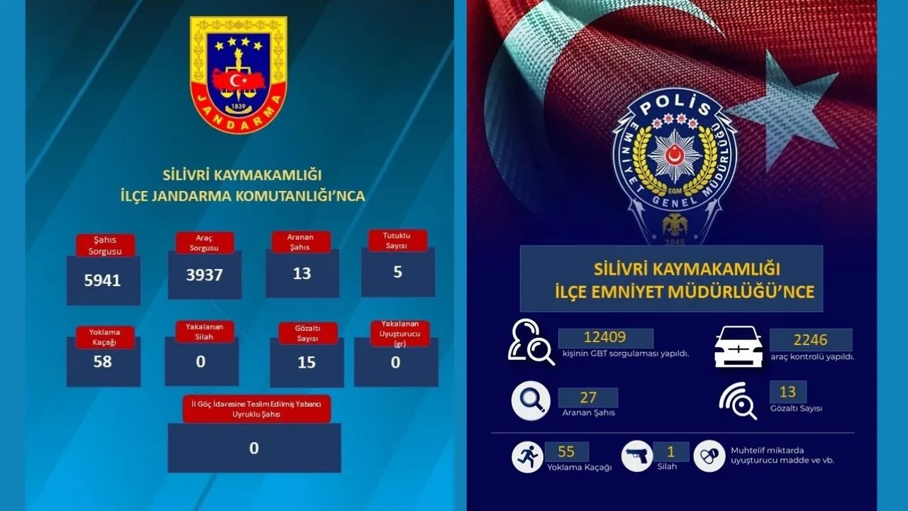 Silivri İlçe Emniyet Müdürlüğü ekipleri, aynı tarihlerde 12.409 kişinin GBT sorgusunu yaptı ve 2.246 aracı kontrol etti. Denetimlerde 27 aranan şahıs ve 55 yoklama kaçağı yakalandı. 1 silah ele geçirilirken, muhtelif miktarda uyuşturucu madde bulundu. 13 kişi gözaltına alındı.