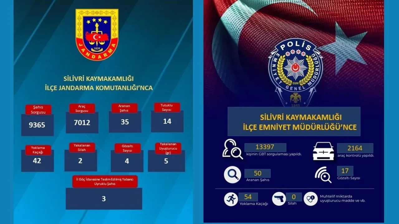 Silivri İlçe Jandarma Komutanlığı ekiplerince aynı tarihlerde yapılan kontrollerde 9.365 kişi ve 7.012 araç sorgulandı. Denetimler sonucunda 35 aranan şahıs yakalanırken, 14 kişi tutuklandı, 4 kişi ise gözaltına alındı. Ayrıca 42 yoklama kaçağı, 2 ruhsatsız silah ve 5 gram yasaklı madde ele geçirildi. 3 yabancı uyruklu şahıs da İl Göç İdaresi’ne teslim edildi.