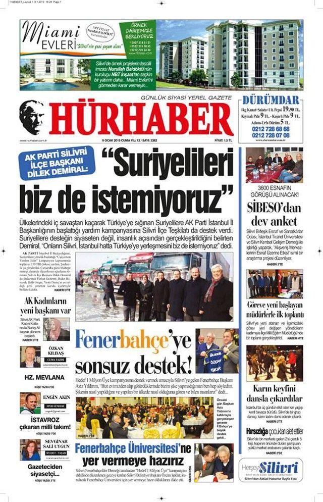 Silivri’nin yerel merkezli gazeteleri olan Hürhaber ve Kasaba Gazetelerinin 09 Ocak 2015 tarihli 1.Sayfalarında bugün;