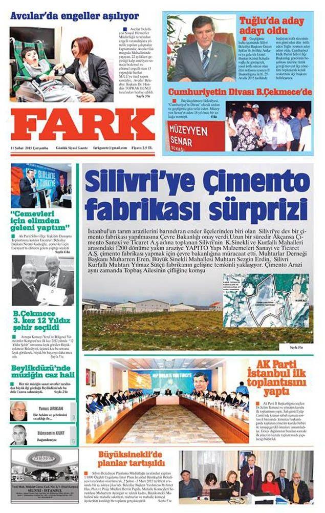 Silivri’nin yerel merkezli gazeteleri olan Hürhaber, Kasaba ve Fark Gazetelerinin 11 Şubat 2015 tarihli 1.Sayfalarında bugün;