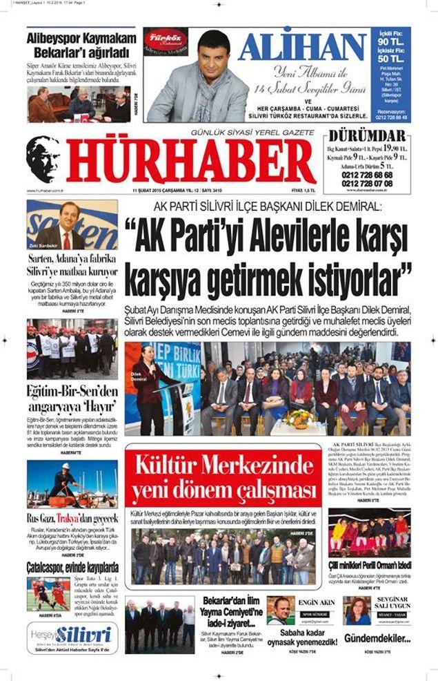Silivri'nin yerel merkezli gazeteleri olan Hürhaber, Kasaba ve Fark Gazetelerinin 11 Şubat 2015 tarihli 1.Sayfalarında bugün