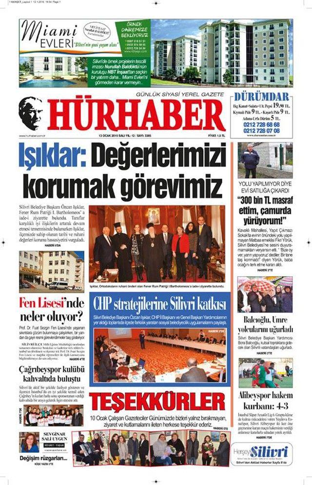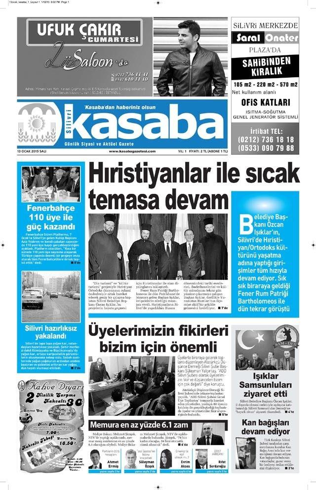 Silivri’nin yerel merkezli gazeteleri olan Hürhaber ve Kasaba Gazetelerinin 13 Ocak 2015 tarihli 1.Sayfalarında bugün;