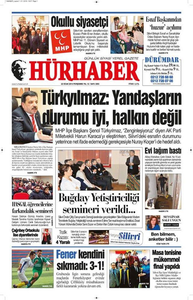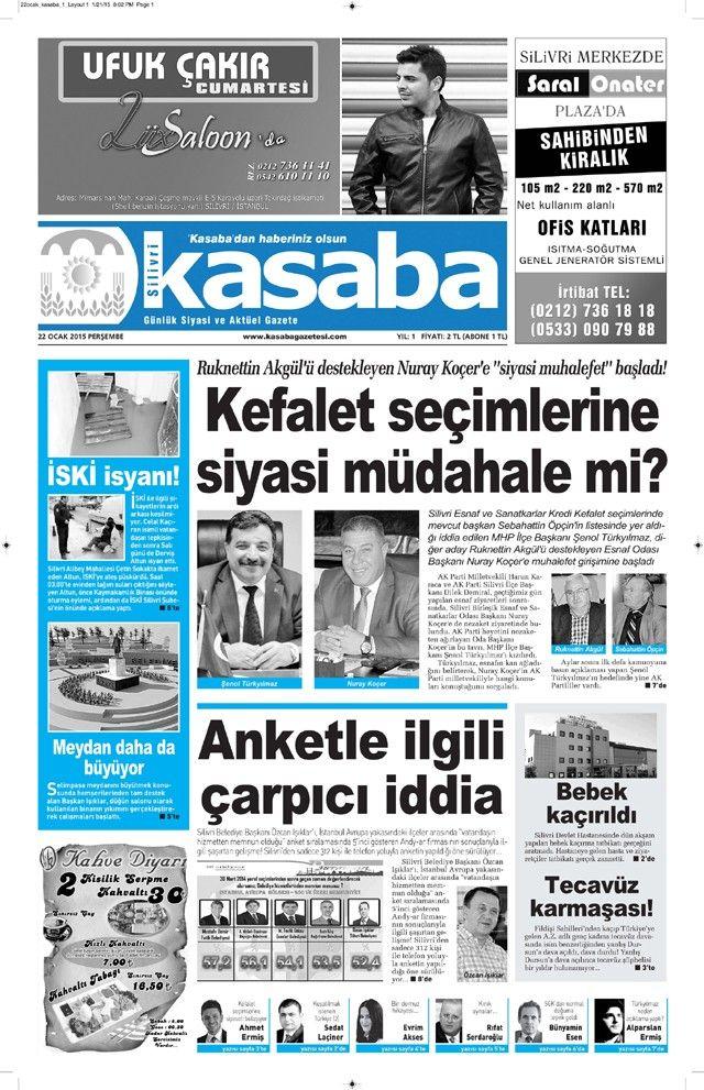 Silivri’nin yerel merkezli gazeteleri olan Hürhaber ve Kasaba Gazetelerinin 22 Ocak 2015 tarihli 1.Sayfalarında bugün;
