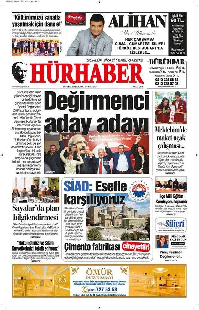Silivri'nin yerel merkezli gazeteleri olan Hürhaber, Kasaba ve Fark Gazetelerinin 24 Şubat 2015 tarihli 1.Sayfalarında bugün