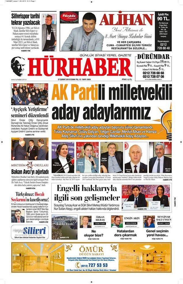 Silivri’nin yerel merkezli gazeteleri olan Hürhaber, Kasaba ve Fark Gazetelerinin 27 Şubat 2015 tarihli 1.Sayfalarında bugün;
