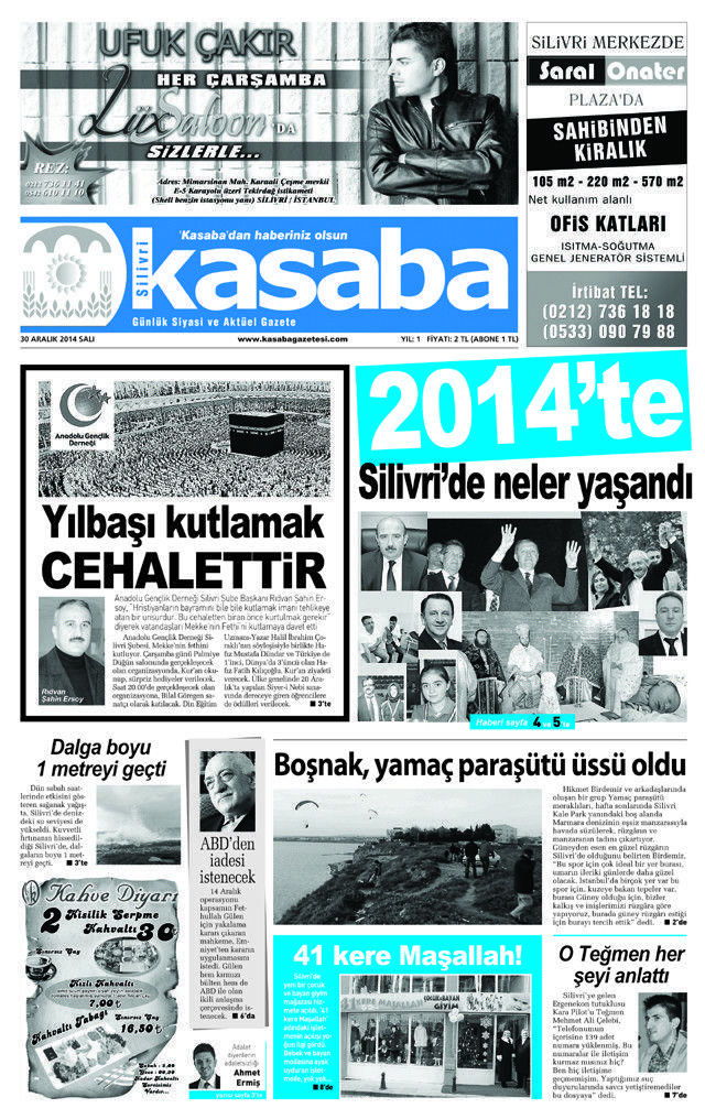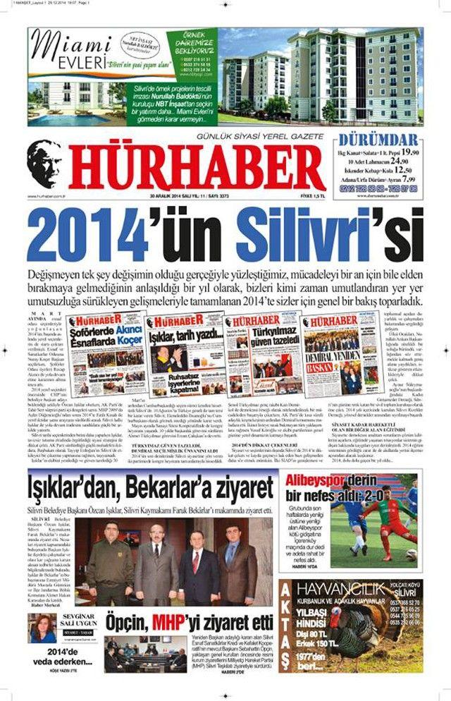 Silivri’nin yerel merkezli gazeteleri olan Hürhaber ve Kasaba Gazetelerinin 30 Aralık 2014 tarihli 1.Sayfalarında bugün;