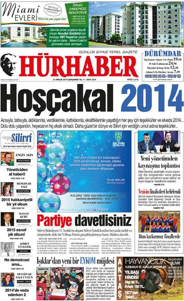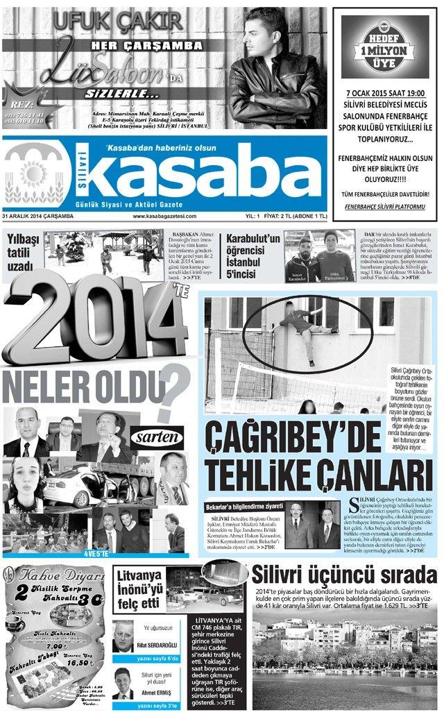 Silivri'nin yerel merkezli gazeteleri olan Hürhaber ve Kasaba Gazetelerinin 31 Aralık 2014 tarihli 1.Sayfalarında bugün
