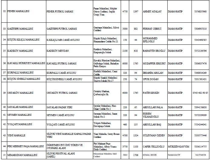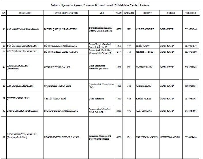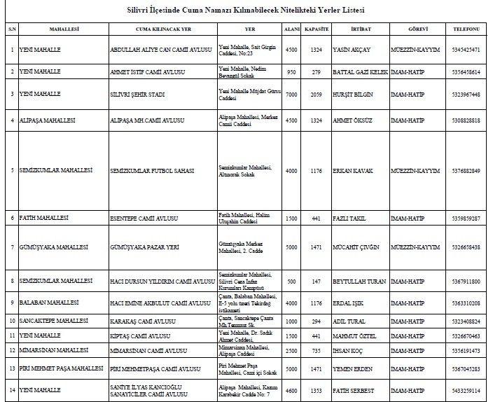 Silivri Kaymakamlığından yapılan açıklamada 29 Mayıs'ta Cuma namazı kılınacak 45 yer belirtildi..Buna göre Silivri'de Cuma namazı kılınacak olan adresler şöyle;