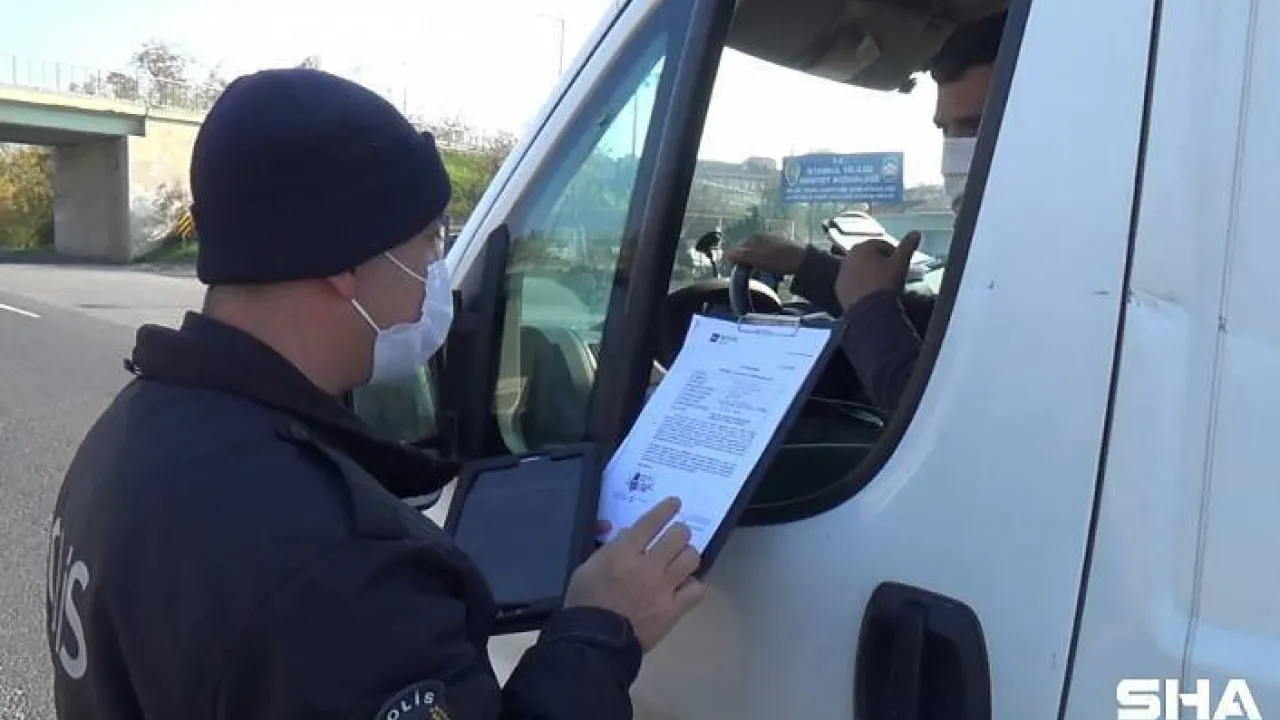 Silivri Bölge Trafik Denetleme İstasyonu'nda yapılan uygulamada, sürücülere GBT sorgulaması yapılırken, kısıtlama kapsamında izin belgeleri olup olmadığı kontrol edildi.