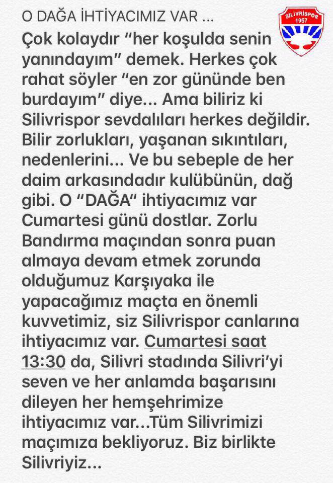 Ara transferde yaptığı takviyelerle takımı güçlendiren ve ilk haftaki aldığı sonuçla ikinci yarıya moralli başlayan Silivrispor, Karşıyakaspor’u devirip çıkışını devam ettirmek istiyor. Karşıyakaspor maçında Silivrispor taraftarına çok güvenen Kulüp Başkanı Akgün Duru sosyal medya üzerinden yayınladığı mesajla taraftardan tam destek istedi. Duru’nun sosyal medyadan paylaştığı mesaj şöyle :