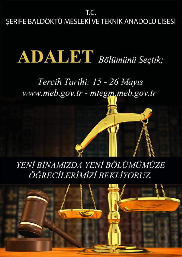 Şerife Baldöktü Mesleki ve Teknik Anadolu Lisesi bünyesinde açılacak olan adalet bölümü yeni eğitim öğretim yılında faaliyetine başlayacağı öğrenildi.