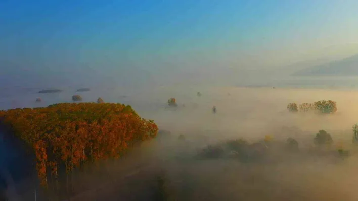 Sakarya'nın Akyazı ilçesinde etkili olan sis güneş ile bütünleşince seyrine doyumsuz manzaralar ortaya çıktı.