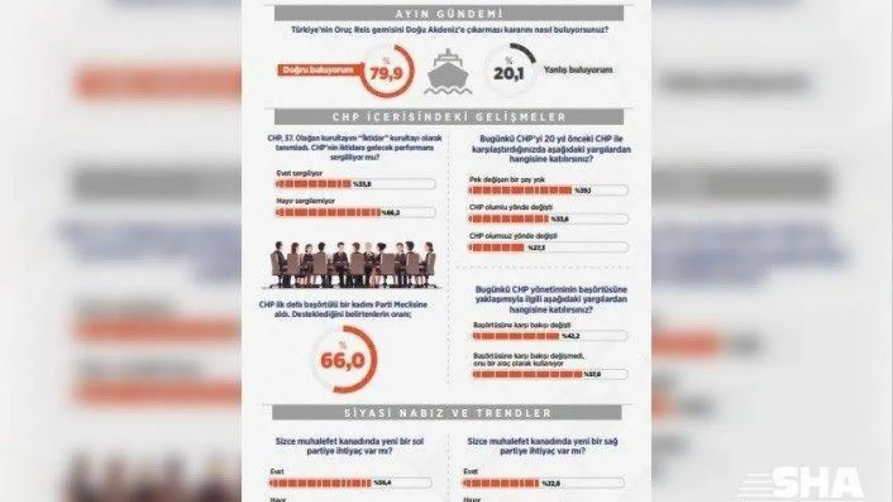 CHP yönetimi son kurultayla birlikte ilk kez bir başörtülüyü parti meclisi üyeliği konumuna getirdi. Bu gelişmeyi destekleyenlerin oranı yüzde 66 olurken, araştırma kapsamında katılımcılara “CHP yönetiminin başörtüsüne yaklaşımıyla ilgili aşağıdaki yargılardan hangisina katılırsınız” sorusu da yöneltildi. Katılımcıların yüzde 57,8’i “Başörtüsüne karşı bakışı değişmedi onu bir araç olarak kullanıyor” yanıtı verirken, yüzde 42,2’si ise CHP’nin başörtüsüne bakışının değiştiğini savundu.