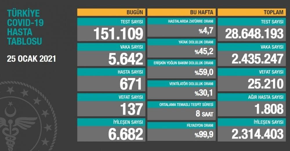Sağlık Bakanlığının Covid-19 bilgilendirme sayfasında Türkiye'nin güncel korona virüs tablosu kamuoyuyla paylaşıldı. Tabloya göre son 24 saatte 137 kişi korona virüsten hayatını kaybetti, toplam can kaybı 25 bin 210'a yükseldi. Toplamda 28 milyon 648 bin 193 test yapıldı. Bugün yapılan 151 bin 109 testten 5 bin 642 yeni vaka sayısı, 671 de yeni hasta sayısı olduğu belirtildi. Toplam vaka sayısının 2 milyon 435 bin 247 olduğu, bugün iyileşen 6 bin 682 kişiyle birlikte toplam iyileşen hasta sayısının 2 milyon 134 bin 403'e yükseldiği, toplam hastalarda zatürre oranının yüzde 4,7, ağır hasta sayısının ise 1 bin 808 olduğu açıklandı.