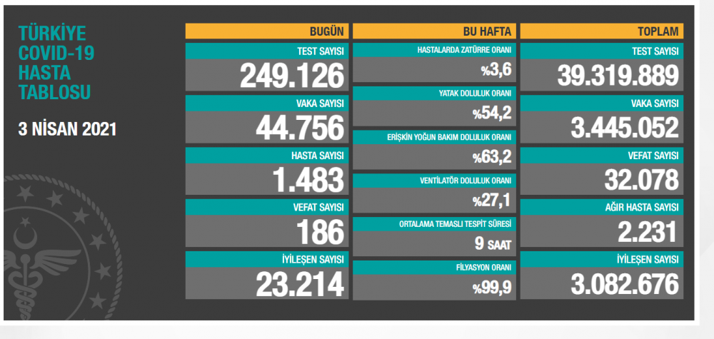 Sağlık Bakanlığının Covid-19 bilgilendirme sayfasında Türkiye'nin güncel korona virüs tablosu kamuoyuyla paylaşıldı. Tabloya göre son 24 saatte 186 kişi korona virüsten hayatını kaybetti, toplam can kaybı 32 bin 78'e yükseldi. Toplamda 34 milyon 993 test yapıldı. Bugün yapılan 249 bin 126 testten, 44 bin 756 yeni vaka sayısı, bin 483 de yeni hasta sayısı olduğu belirtildi. Toplam vaka sayısının 3 milyon 445 bin 52, bugün iyileşen 23 bin 214 kişiyle toplam iyileşen hasta sayısının 3 milyon 82 bin 676'ya yükseldiği, toplam hastalarda zatürre oranının yüzde 3,6, ağır hasta sayısının ise 2 bin 231 olduğu açıklandı.