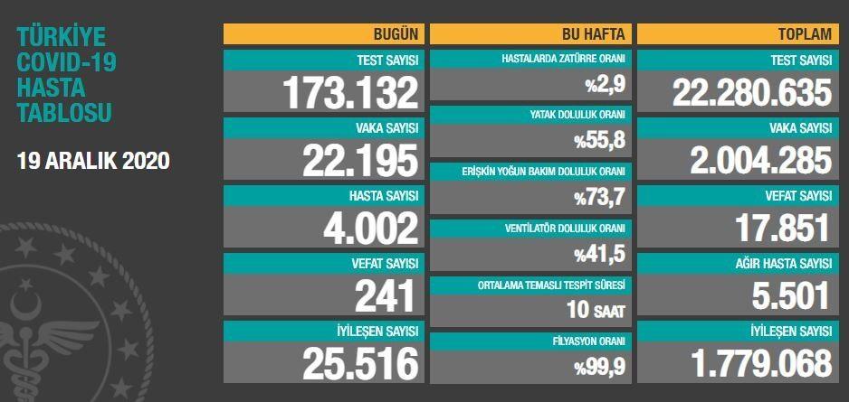 Sağlık Bakanlığı son 24 saatte 241 kişinin korona virüsten hayatını kaybettiğini, 22 bin 195 yeni vaka sayısının olduğu açıkladı.
