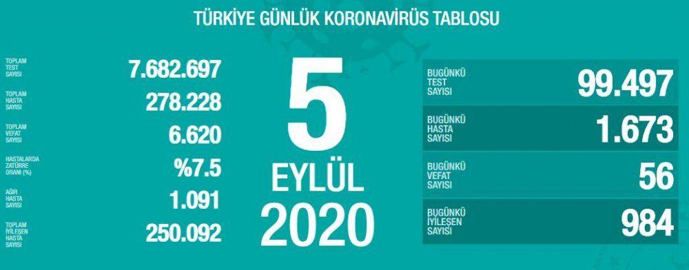 Sağlık Bakanlığının Covid-19 bilgilendirme sayfasında Türkiye'nin güncel korona virüs tablosu kamuoyuyla paylaşıldı. Tabloya göre son 24 saatte 56 kişi korona virüsten hayatını kaybetti, toplam can kaybı 6 bin 620'ye yükseldi. Bugün toplam 99 bin 497 test yapılırken, bin 673 yeni vaka tanısı konuldu.
