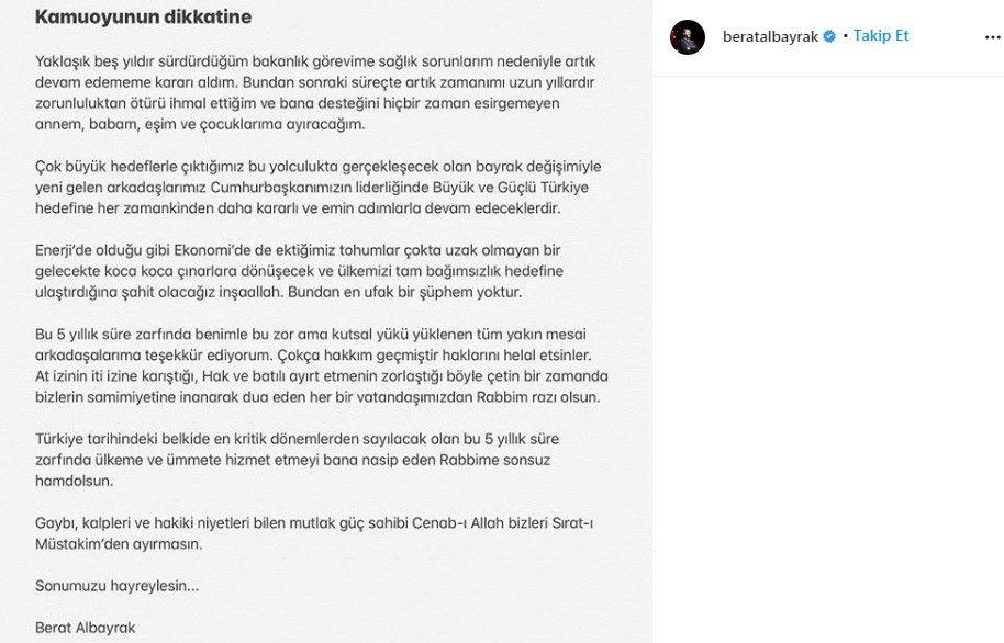 - Son Dakika: Hazine ve Maliye Bakanı Berat Albayrak'ın Instagram hesabından 'istifa açıklaması' yapıldı