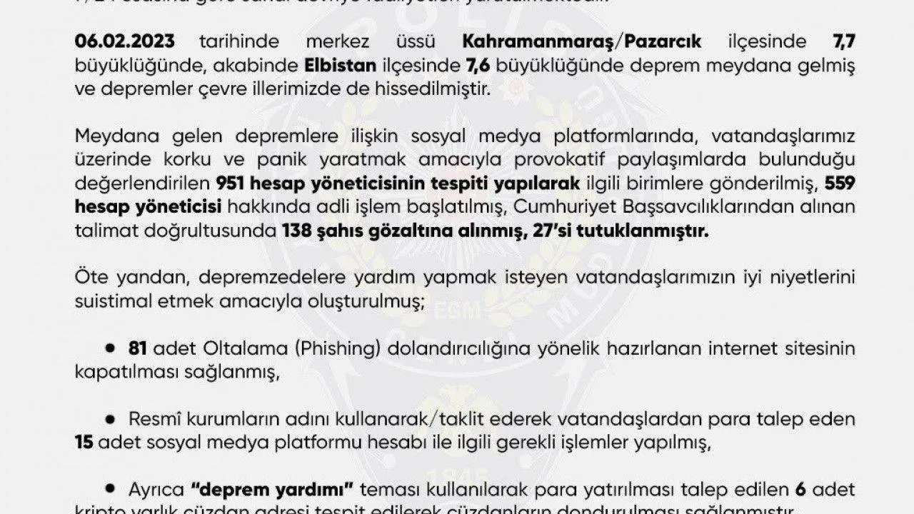 Emniyet Genel Müdürlüğü Siber Suçlarla Mücadele Daire Başkanlığı, kanunların verdiği yetki çerçevesinde, suç ve suçlularla mücadele amacıyla, internet ortamında 7 gün 24 saat esasına göre sanal faaliyetleri yürütüyor. Meydana gelen depremlere ilişkin sosyal medya platformlarında, vatandaşlar üzerinde korku ve panik oluşturmak amacıyla provokatif paylaşımlarda bulunduğu değerlendirilen 951 hesap yöneticisinin tespiti yapılarak ilgili birimlere gönderildi. 559 hesap yöneticisi hakkında ise adli işlem başlatıldı. Ardından Cumhuriyet Başsavcılıklarından alınan talimat doğrultusunda 138 şahıs gözaltına alınırken, 27 kişi ise tutuklandı.