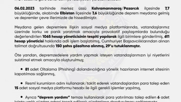 Kahramanmaraş’ta meydana gelen depremlere ilişkin sosyal medya platformlarında, vatandaşlar üzerinde korku ve panik oluşturmak amacıyla provokatif paylaşımlarda bulunduğu değerlendirilen bin 65 hesap yöneticisinin tespiti yapılarak, ilgili birimlere gönderildi. 611 hesap yöneticisi hakkında ise adli işlem başlatıldı. Ardından Cumhuriyet Başsavcılıklarından alınan talimat doğrultusunda 150 şahıs gözaltına alınırken, 29 kişi ise tutuklandı.
