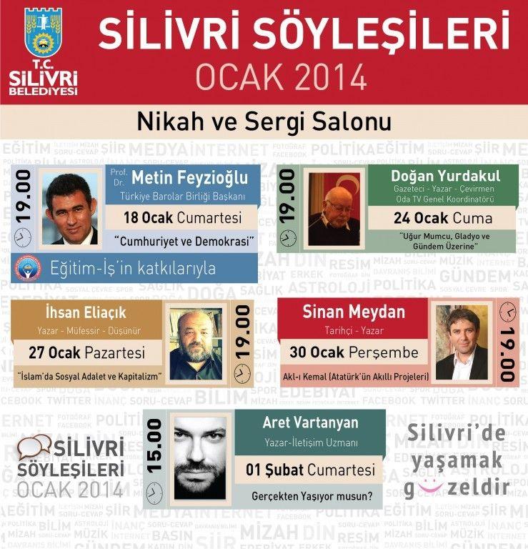 Silivri Belediyesi tarafından düzenlenen Silivri Söyleşileri devam ediyor. Her ay gerçekleşecek söyleşi günleri kapsamında birbirinden ünlü gazeteci, yazar ve şairler Silivrililerle buluşuyor. Silivrililer tarafından yoğun ilgi gören ve ilgiyle takip edilen kasım ayı söyleşi programının ardından ocak ayı programı da dopdolu geçecek. Ocak ayı programı kapsamında; Türkiye Barolar Birliği Başkanı Profesör Metin Feyzioğlu, Gazeteci- Yazar Oda TV Genel Koordinatörü Doğan Yurdakul, Yazar- Müfessir- Düşünür İhsan Eliaçık, Tarihçi- Yazar Sinan Meydan ve Yazar- İletişim Uzmanı Aret Vartanyan Silivrililerle buluşacak.