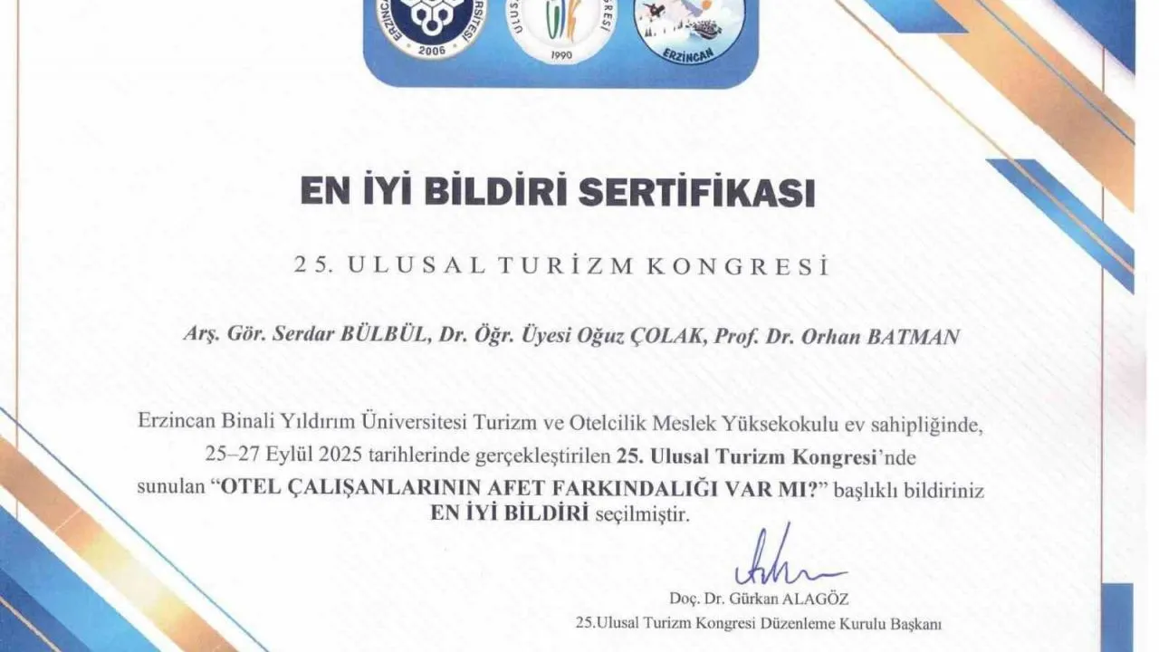 Sakarya Uygulamalı Bilimler Üniversitesi (SUBÜ) Turizm Fakültesi Turizm İşletmeciliği Bölümü öğretim elemanları Prof. Dr. Orhan Batman, Dr. Öğretim Üyesi Oğuz Çolak ve Araştırma Görevlisi Serdar Bülbül; ‘Otel Çalışanlarının Afet Farkındalığı Var Mı?’ başlıklı bildirileriyle 25’inci Ulusal Turizm Kongresi’nde ‘En İyi Bildiri’ ödülünün sahibi oldu. Erzincan Binali Yıldırım Üniversitesi ev sahipliğinde düzenlenen kongrede, Türkiye’nin farklı üniversitelerinden akademisyenler turizm alanındaki güncel araştırmalarını paylaştı. SUBÜ öğretim elemanlarının bildirisi, akademik içeriği ve yöntemiyle öne çıkarak kongre bilim kurulunca ‘En İyi Bildiri’ seçildi. Bildiri çalışması, SUBÜ Bilimsel Araştırma Projeleri Koordinatörlüğü (BAP) tarafından desteklenen Hızlı Destek Projesi çerçevesinde hazırlandı.