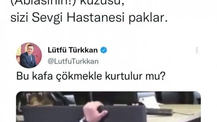 İçişleri Bakanı Süleyman Soylu, İYİ Parti Kocaeli Milletvekili Lütfü Türkkan’ın kendisine yönelik paylaşımına, "Şehit ailesine küfreden aşağılık, geçmişini bütün çevremizin bildiği fersude, devleti dolandıran hırsız, (Ablasının!) kuzusu, sizi Sevgi Hastanesi paklar" diye yanıt verdi.