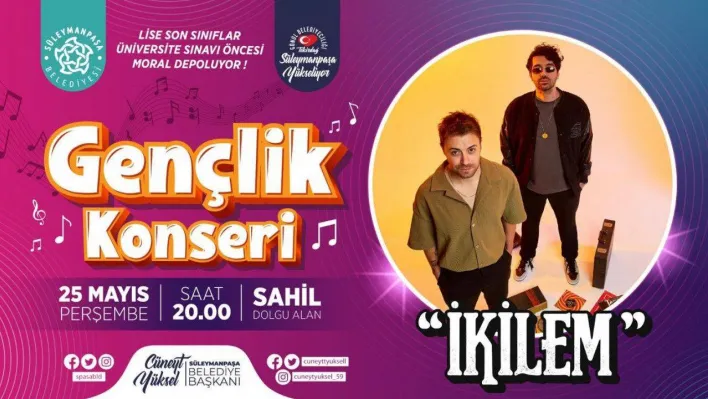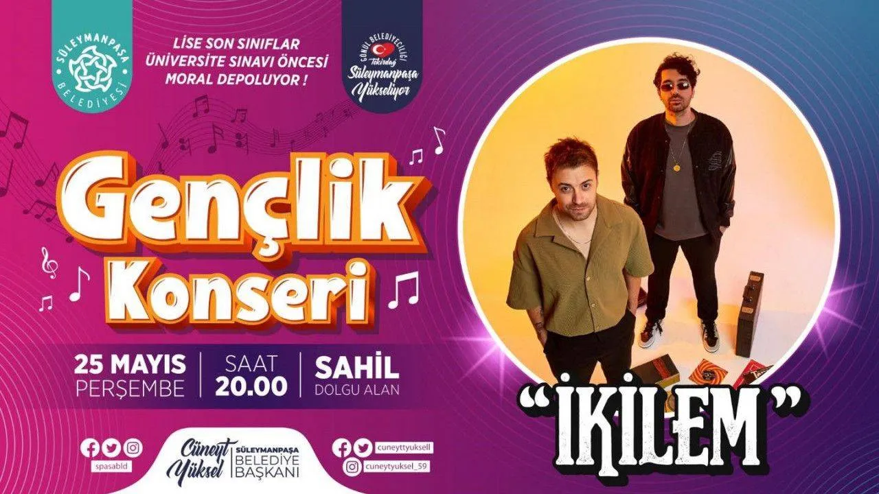 25 Mayıs Perşembe günü saat 20.00’de, Sahil dolgu alanda gerçekleştirilecek olan konserde, gençler arasında oldukça popüler olan İkilem grubu sahne alacak. Sevilen şarkılarını Süleymanpaşalı gençler için seslendirecek olan topluluk, Süleymanpaşa’da ilk kez konser verecek.