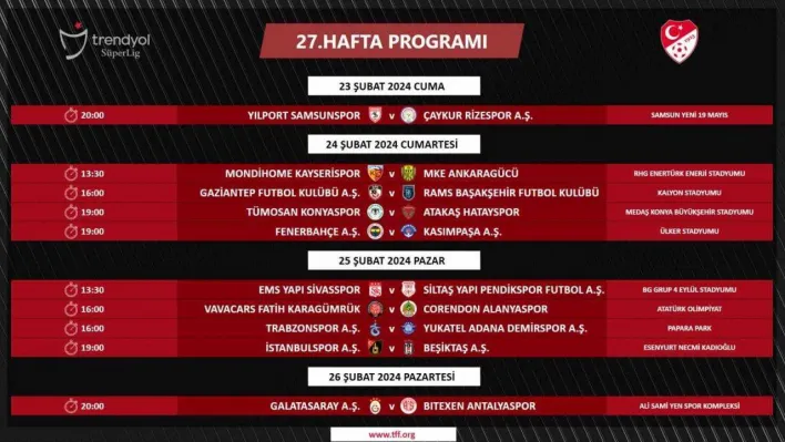 Trendyol Süper Lig’in 27, 28, 29 ve 30. haftalarında oynanacak maçların programı Türkiye Futbol Federasyonu (TFF) tarafından açıklandı. Ligin 28. haftasında Beşiktaş’ın, Galatasaray’ı ağırlayacağı mücadele 3 Mart Pazar günü saat 19.00’da yapılacak. Süper Lig’in 30. haftasında ise Trabzonspor ile Fenerbahçe 17 Mart Pazar günü saat 20.30’da karşı karşıya gelecek.
