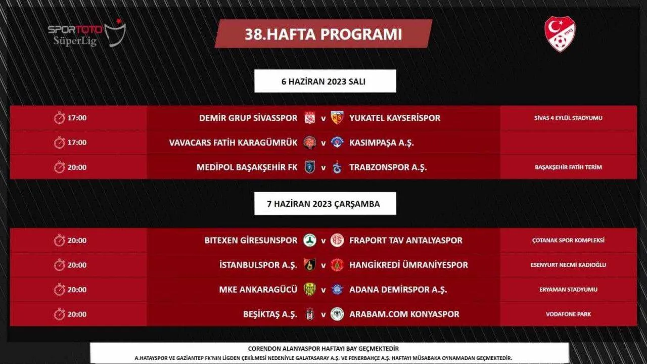 Spor Toto Süper Lig’de 38. hafta karşılaşmaları 6 Haziran Salı ve 7 Haziran Çarşamba günü oynanacak.