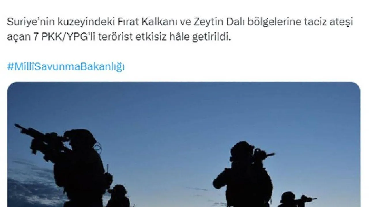 Milli Savunma Bakanlığının sosyal medya hesabından yapılan paylaşımda, “Kahraman Mehmetçik, teröristlerin taciz ve saldırı girişimlerine misliyle karşılık vermeye devam ediyor. Suriye’nin kuzeyindeki Fırat Kalkanı ve Zeytin Dalı bölgelerine taciz ateşi açan 7 PKK/YPG’li terörist etkisiz hale getirildi” ifadelerine yer verildi.