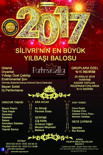 Patronella Organizasyon tarafından Palmiye Balo Salonunda yapılacak olan Yılbaşı Balosu ile ilgili program detayına da değinen Yıldız, "Öncelikle insanların hafızasındaki düğün salonu algısının bizi zorlayacağı çevremiz tarafından çok ifade edildi. Ancak göreceksiniz ki bu bir düğün salonu organizasyonu değil, tam anlamıyla eksiksiz bir balo. İşe önce mekanın iç dizaynını değiştirerek başladık. Silivrililerin alışık olduğu Palmiye Düğün Salonu o gece tüm iç mimarisi ile değişmiş olarak karşınıza çıkacak. Sizi bir balo salonu bekliyor olacak. Sonra ses sistemi. Konser ve eğlence gecenin en önemli ayaklarından biri. O nedenle profesyonel bir konser tesisatına ihtiyaç olduğuna karar verdik ve ses sistemini değiştirdik. Özel bir ses sistemi kiraladık. Buna yakışır sanatçılarla anlaştık. Akşam saat 20:00'de akşam yemeği ile başlayacak balomuz. Yemekte misafirlerimize gitarı ile Silivri'nin sevilen seslerinden Erhan eşlik edecek. Zengin yemek menümüz zaten afişlerimizde de görülüyor. Gece içerisinde oryantal şov, enstrümental müzik ziyafeti, Popstar Tayfun, Ebru Heyder konseri, DJ Aydo performansı, Yılbaşı özel çekilişi yer alacak. Tabi ki bu etkinliklerin aralarında da misafirlerimizi çeşitli sürprizler bekliyor. Limitsiz yerli içkimiz mevcut. Gecenin sonunda misafirlerimize çorba ikramımız olacak. Tüm misafirlerimize gecenin sonunda hangover kit hediye edeceğiz. Böylece sizi yılbaşı gecesi sona erdiğinde terk etmiş olmayacağız. Bir sonraki gün de size eşlik ediyor olacağız. Yani aslında anlatmakla bitmeyecek bir program akışımız var. En iyisi bütün detayları anlatmak yerine gelen misafirlerimiz ile hep beraber yaşayalım, eğlenelim" dedi.