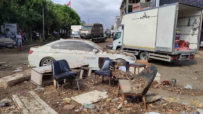İstanbul'da sel sularının etkisiyle büyük çapta hasar alan MASKO Mobilyacılar Sitesi'ndeki temizlik çalışmaları sürüyor.