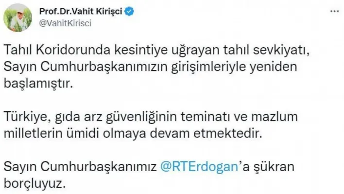 Rusya, geçtiğimiz günlerde tahıl koridorunda gemilerin sevkiyatının durdurulduğunu açıklamıştı. Tarım ve Orman Bakanı Vahit Kirişci, sosyal medya hesabından tahıl koridorunda tekrar sevkiyata başlandığını duyurdu. Kirişci paylaşımında, “Tahıl koridorunda kesintiye uğrayan tahıl sevkiyatı, Sayın Cumhurbaşkanımızın girişimleriyle yeniden başlamıştır. Türkiye, gıda arz güvenliğinin teminatı ve mazlum milletlerin ümidi olmaya devam etmektedir. Cumhurbaşkanımız Recep Tayyip Erdoğan’a şükran borçluyuz” ifadelerini kullandı.