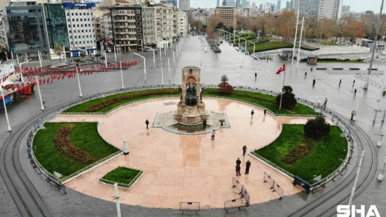 Hafta sonu uygulanan sokağa çıkma kısıtlaması kapsamında Pazar sabahında Taksim Meydanı ve İstiklal Caddesi'nde sessizlik hakim oldu. Turistlere kalan Taksim Meydanı drone ile görüntülendi.