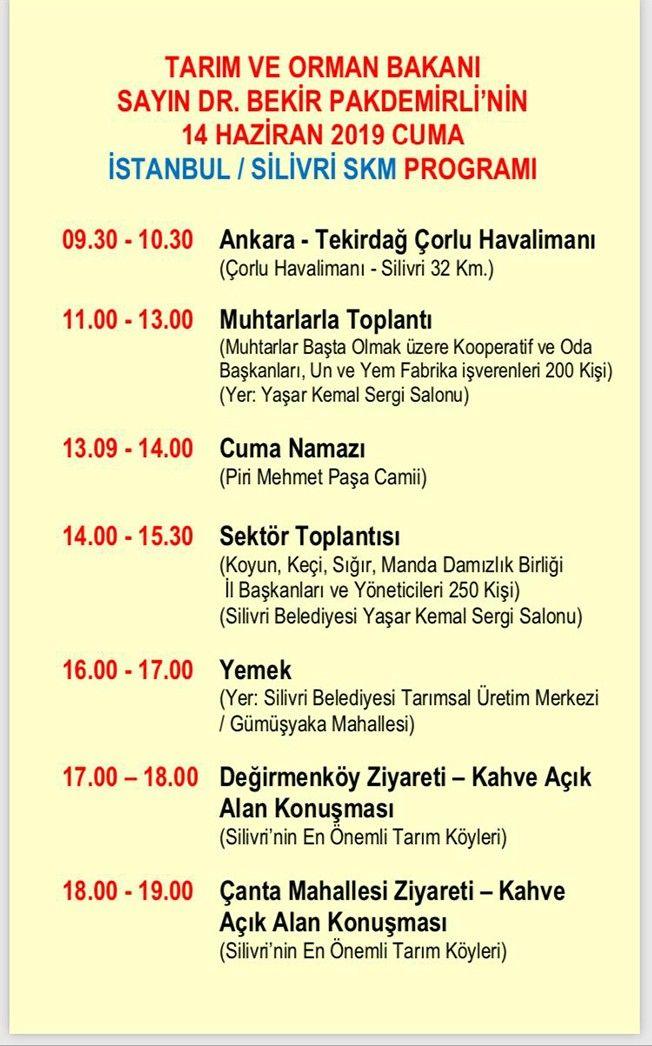 Tarım ve Orman Bakanı Bekir Pakdemirli, 14.05.2019 (yarın) Silivri'ye geliyor. Bakan Pakdemirli'nin Silivri programı şu şekilde:
