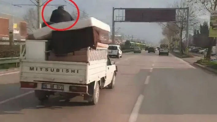 Merkez Osmangazi ilçesi Yeni Karaman Mudanya Caddesi üzerinde açık kasa kamyonet fazla yük yükledi. Yüklerin üzerinde bir kişinin kilometrelerce seyahat ettiğini gören diğer şoförler, korna ile ikaz etse de netice alamadı. Canını hiçe sayarak seyahat eden vatandaş, diğer sürücüler tarafından cep telefonu kamerasıyla kayda alındı.