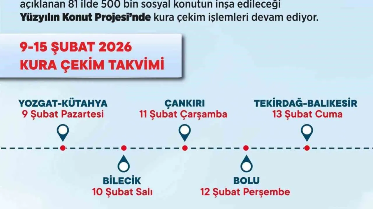 Bakanlık takvimine göre, 9-15 Şubat 2026 haftasında 7 ilde toplam 25 bin 985 sosyal konutun daha kurası çekilecek. Bu kapsamda 13 Şubat Cuma günü Tekirdağ’da 6 bin 865, Balıkesir’de ise 7 bin 548 konutun hak sahipleri belirlenecek. Kura çekimlerinin tamamlanmasıyla birlikte, 15 Şubat itibarıyla kura yapılan il sayısı 57’ye, hak sahibi belirlenen toplam konut sayısı ise 203 bin 111’e ulaşacak.