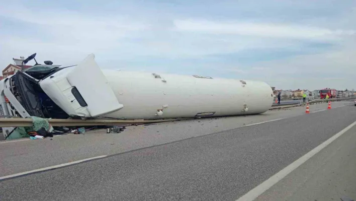 Tekirdağ'da seyir halindeki doğalgaz yüklü tanker devrilirken aracın sürücüsü yaralandı.